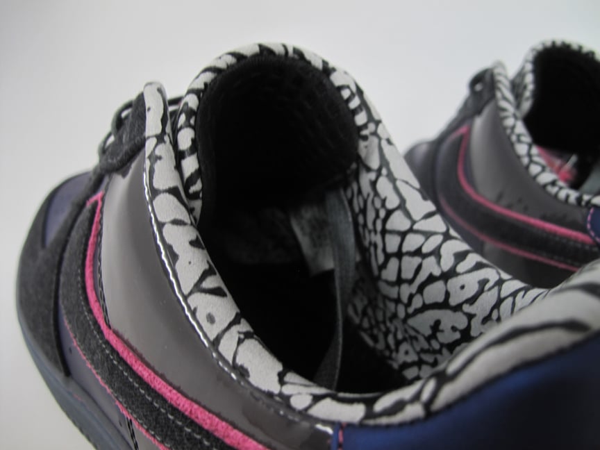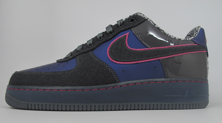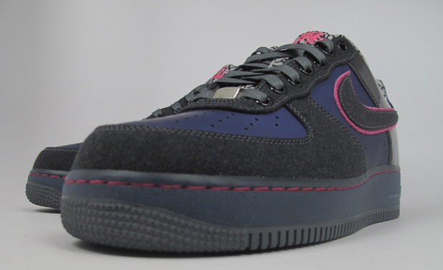 This AF1 features a patent buffed upper in navy blue, black linen toe-box and lace paneling and Swoosh, patent leather heel panel in grey and an elephant print inner sock liner. The shoe comes complete with a touch of pink and waxed laces and custom lace lock.