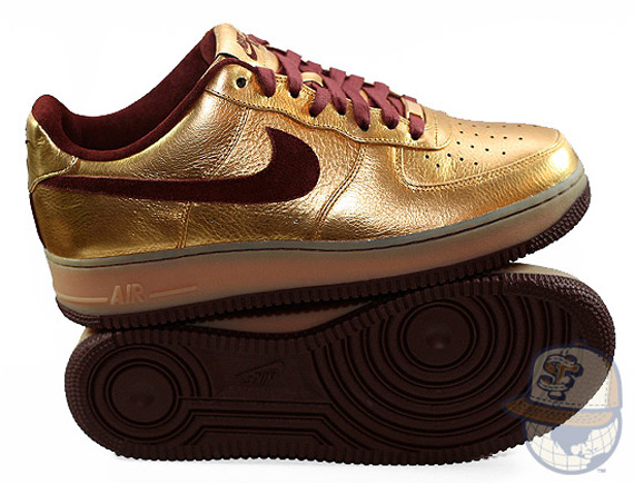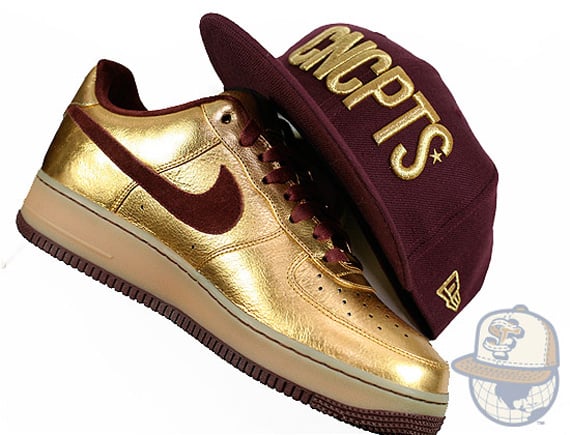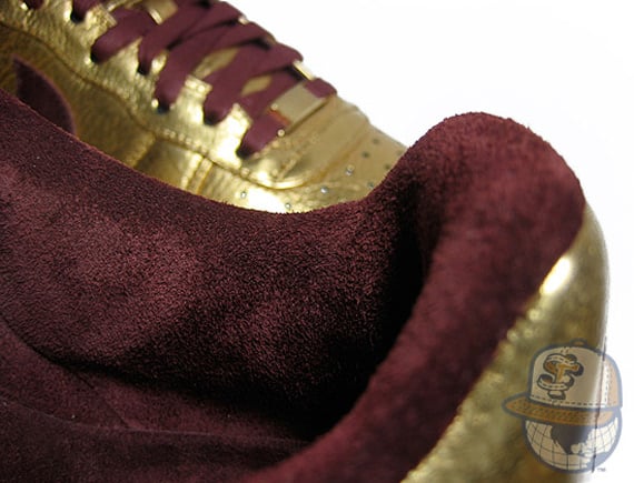 Nike Air Force 1 specialist Mayor has just released his 9 month old baby: a Nike Air Force 1 Bespoke in metallic gold/burgundy. Strictly Fitteds did a “Well Worthy” special with Mayor for the match made in Heaven between his Bespokes and Concept store’s New Era fitted in a matching colorway. The Nike AF1 features a full metallic gold leather upper, with a burgundy nubuck swoosh to match the first ever used burgundy nubuck inner lining. Instead of a typical gumsole, the midsole was given the gum treatment, marking Mayor’s creativity. Of course, Mayor put his name on a gold lace plate to finish off the one of a kind shoe.