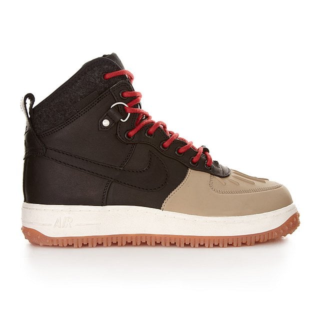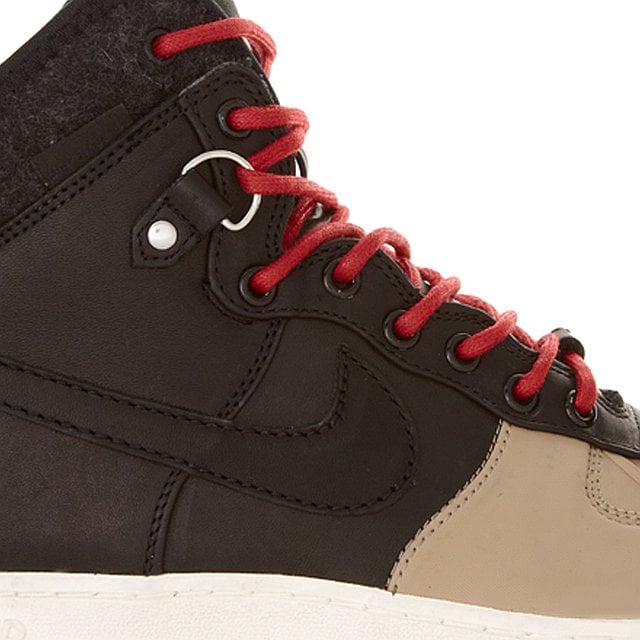 This model, the Nike Air Force 1 Dunk Boot, features reinforced, weatherproof uppers in brown and tan. The shoe comes with red laces and white midsole and is now available for pre-order at Crooked Tongues.