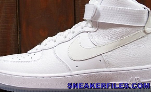 Yesterday, we brought you a look at the Nike Air Force 1 Hi CMFT “White Ice” (officially the Nike Air Force 1 Hi CMFT PRM QS “White/White-White”; talk about excessive, Nike!), a fresh take on the classic Nike AF1 High “All-White” (known on the East Coast as “Uptowns”). Today, we give you a detailed look at this strapped-up banger, set for a July 20th release at Nike.com, as well as select Nike retailers.