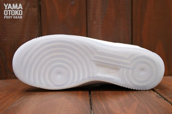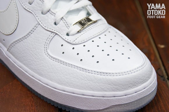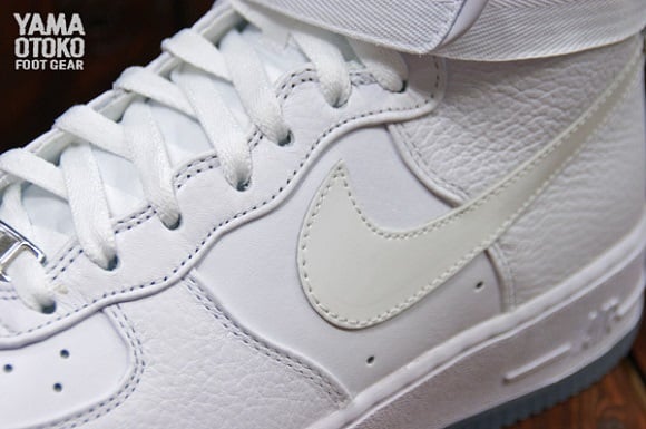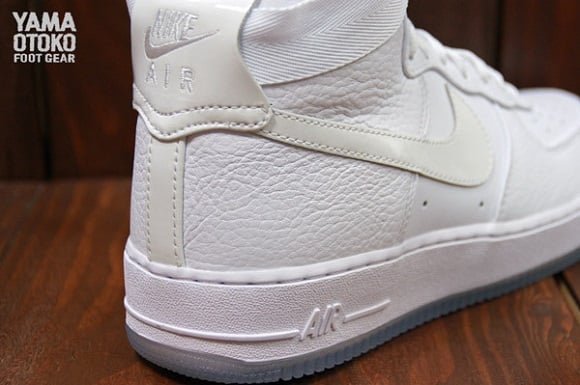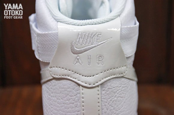 Featuring an all-white premium leather upper, this is not your regular Air Force 1 Hi; patent leather on the Swoosh and heel adds to the premium feel, while an icy outsole keeps things extra-clean. A nylon strap around the collar keeps things secure, while the comfort level is kicked up a notch with the addition of a Zoom Air unit in the heel. A white midsole and white laces finish things off, giving this classy pair of kicks that “classic” touch. Whether re-enacting “White Men Can’t Jump” on the blacktop or taking a stroll on the boardwalk in all-white linens, these kicks will suit you just fine. Hit the jump for a detailed look at these high-top stunners, and let us know if you plan on copping a pair when they drop on the 20th.