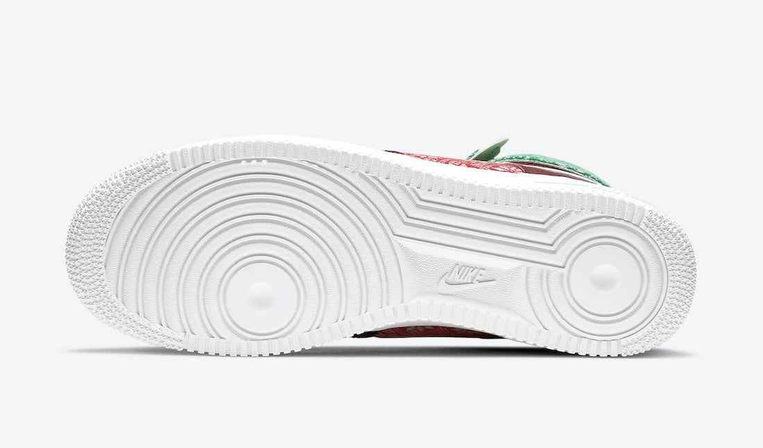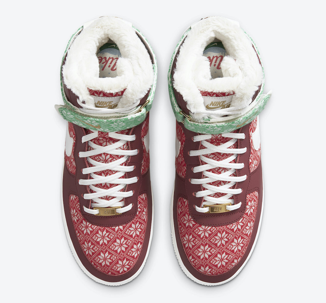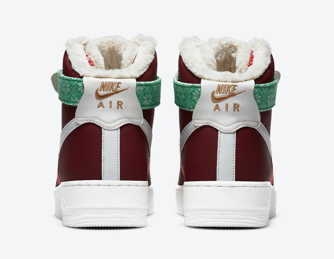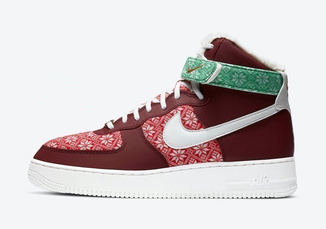 Looking closer, this Nike Air Force 1 High comes in your traditional Red and Green color theme while having a Red sweater on the toe and panel. In addition, we have a Green sweater with more snowflakes on the ankle strap and a plush liner. A darker shade of Red is applied to the overlays, Metallic Gold on the Swoosh and lace jewel, a snow globe lands on the insoles while White lands on the tongue, Swoosh, laces, midsole, and outsole to finish the look.