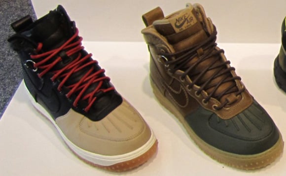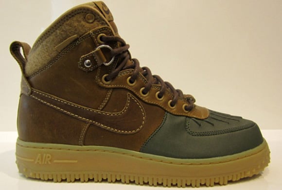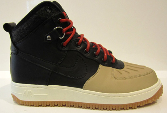 Nike knows how to change up their popular models, just look at their hybrids. This time, the Nike Air Force 1 High gets a “Duckboot” treatment, which will release Fall 2011. We have a look at two pairs of the Nike Air Force 1 High Duckboot; from left to right we have a black and tan pair, and a two tone brown. Both will have the same lining on the toe box that Duckboots have, and wool material on the upper heel.