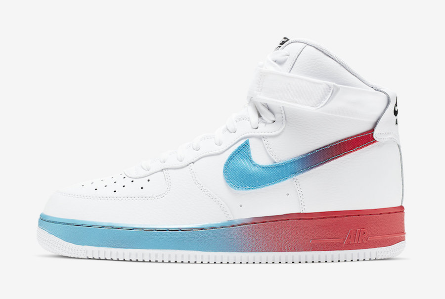 Dressed in a White, Blue Fury, Black and Ember Glow color combination. This Nike Air Force 1 High comes with White leather across the upper while Black lands on the tongue, insole and heel branding. On the Swoosh across the panels and midsole is a Blue Fury to Ember Glow gradient. Completing the look is a White rubber outsole.