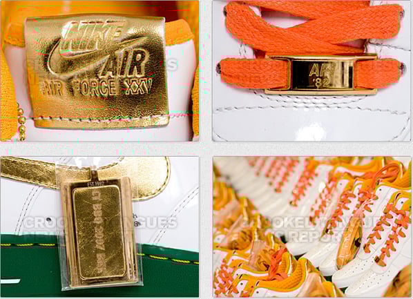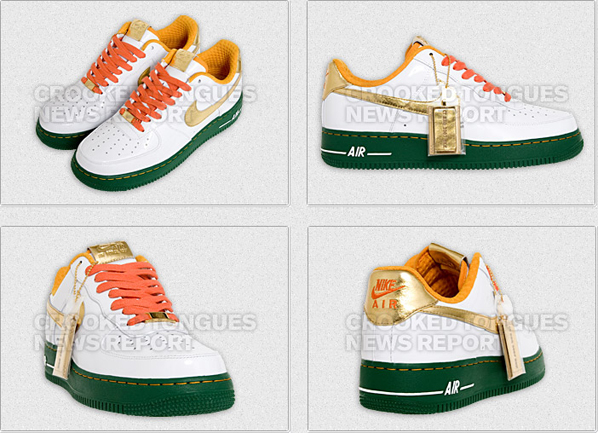 In conjunction with the Crooked Tongues BBQ this Sunday, Nike iD has joined up with them to produce a limited run of Nike Air Force Ones. They feature a solid Green sole, White uppers, accents of Gold and to finish them off a set of Orange laces. Only releasing at the event this Sunday, and 50 pairs will be available. Via CT.