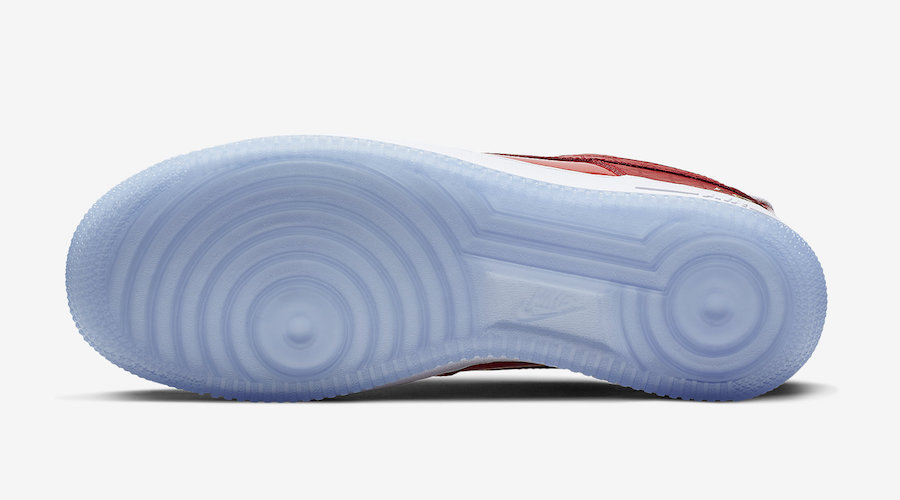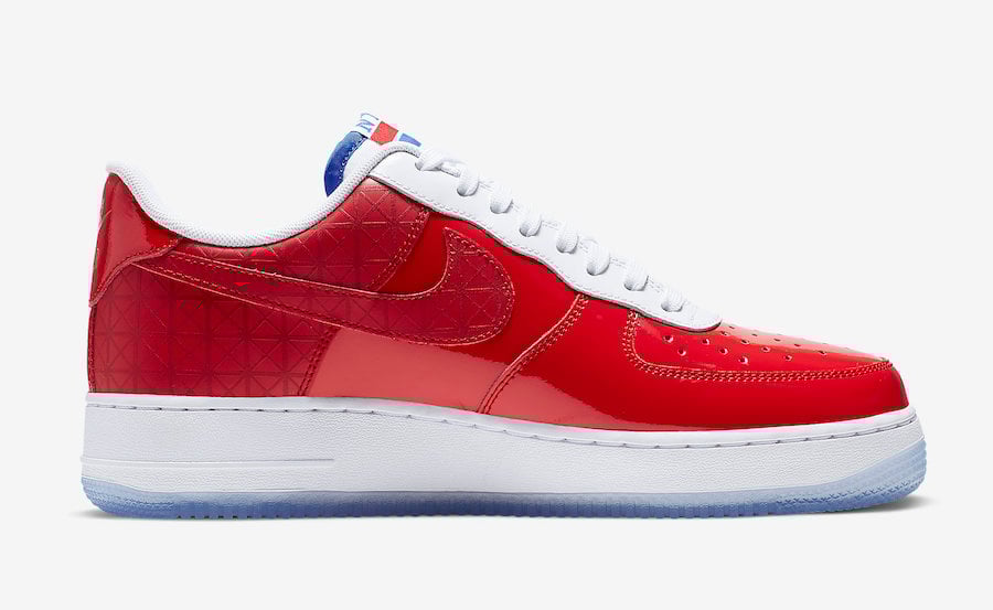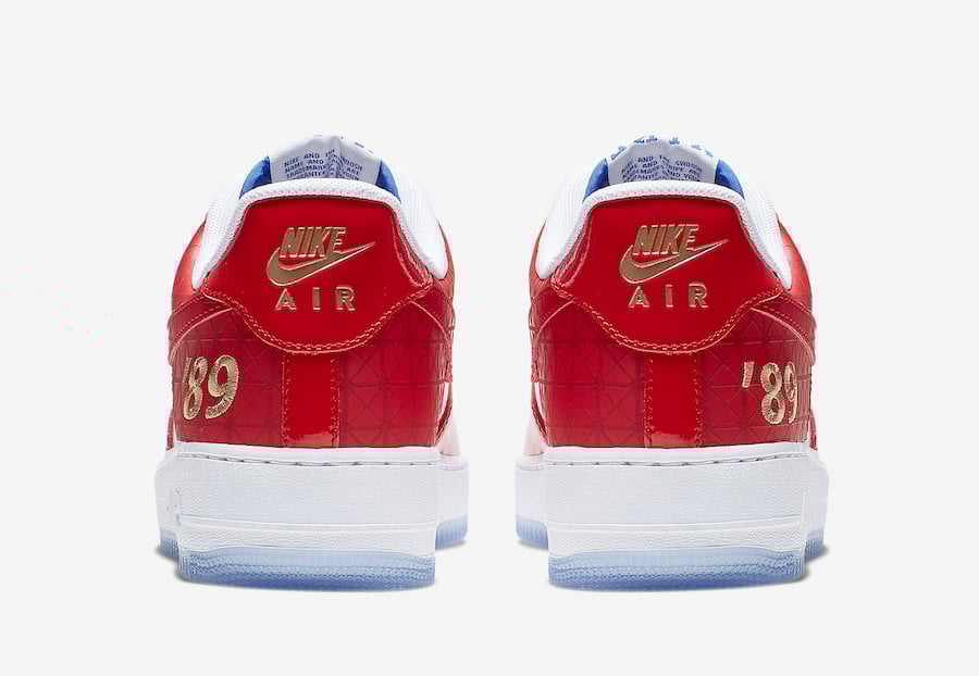 This Nike Air Force 1 Low comes dressed in a Red, White, Blue and Gold color combination which machines the Detroit Pistons colors. In addition we have Red patent leather on the upper and a unique pattern on the Swoosh and by the heel. In Gold we have โ89 and Nike Air branding while โThe Dโ and โJust Do Itโ land on the insoles with the Finals font. Other details includes a White midsole and icy translucent outsole.
