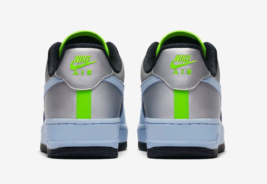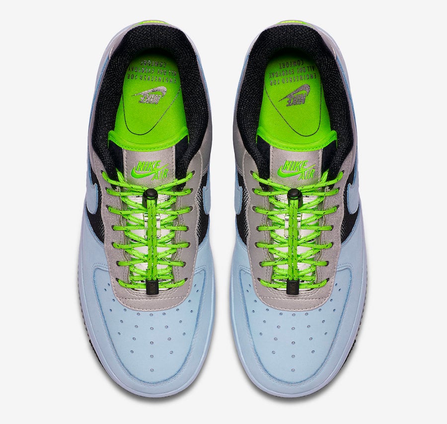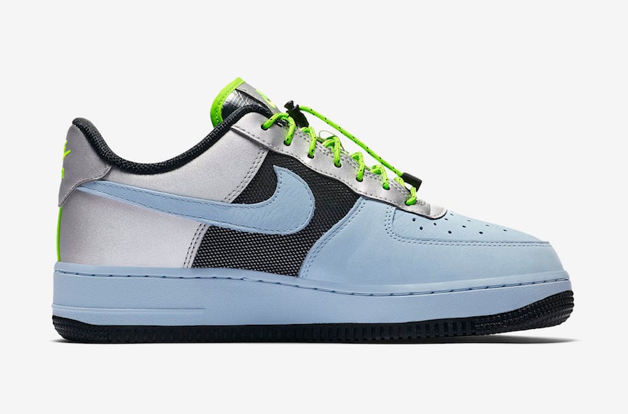 This Nike Air Force 1 Low comes dressed in a Baby Blue, Volt, Black and Silver color combination. Baby Blue takes over the toe, Swoosh and midsole while Silver wraps the heel. Following is Black which lands on the mesh panels, tongue, liner and rubber outsole. Other details includes Volt on the toggle lacing system, tongue branding and inside of the tongue to finish the look.