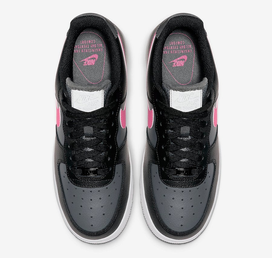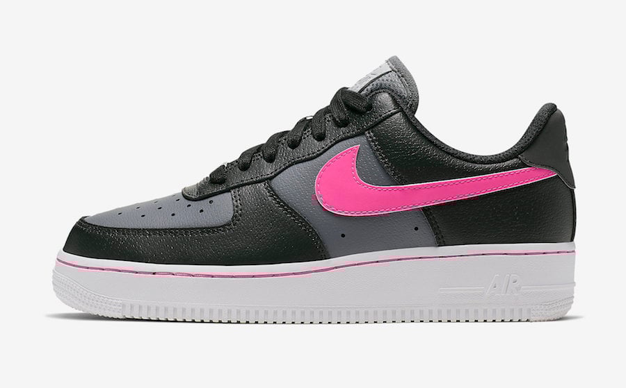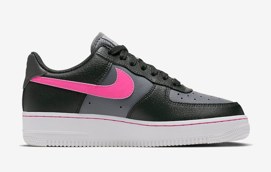 Featuring a Black, Dark Grey, White and Pink Blast color combination. This Nike Air Force 1 Low comes with Black and Grey leather across the upper while Pink lands on the Swoosh logos and trimming. Other highlights includes 3M reflective on the tongue labels and a White midsole and rubber outsole.