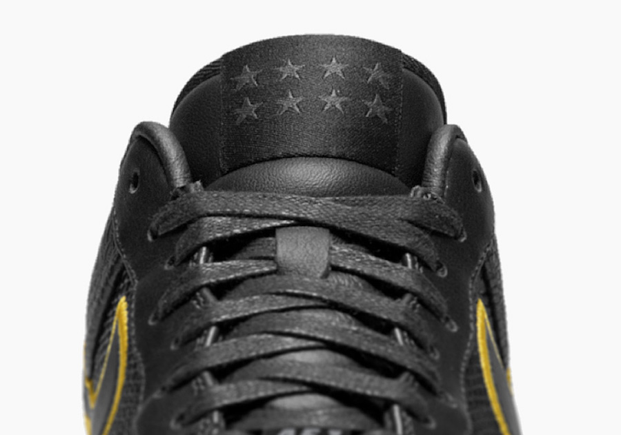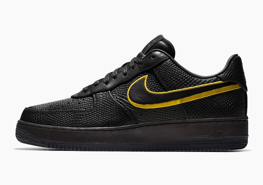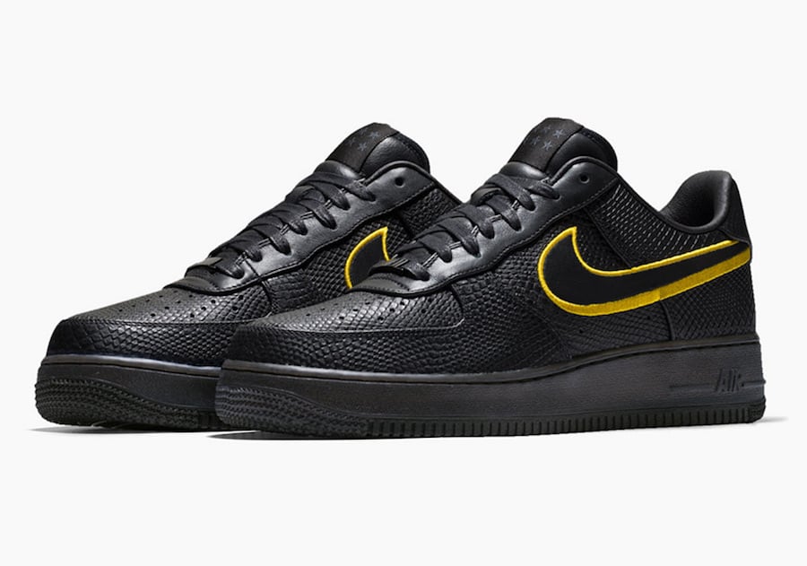As you can see this Nike Air Force 1 Low comes dressed in predominate Black with a Mamba inspired snakeskin used across the uppers. On the heel is both of Kobeโs numbers which are embroidered. Other details includes Yellow accents and eight stars on each tongue which pays tribute to the Lakers titles.