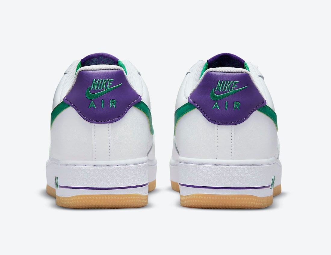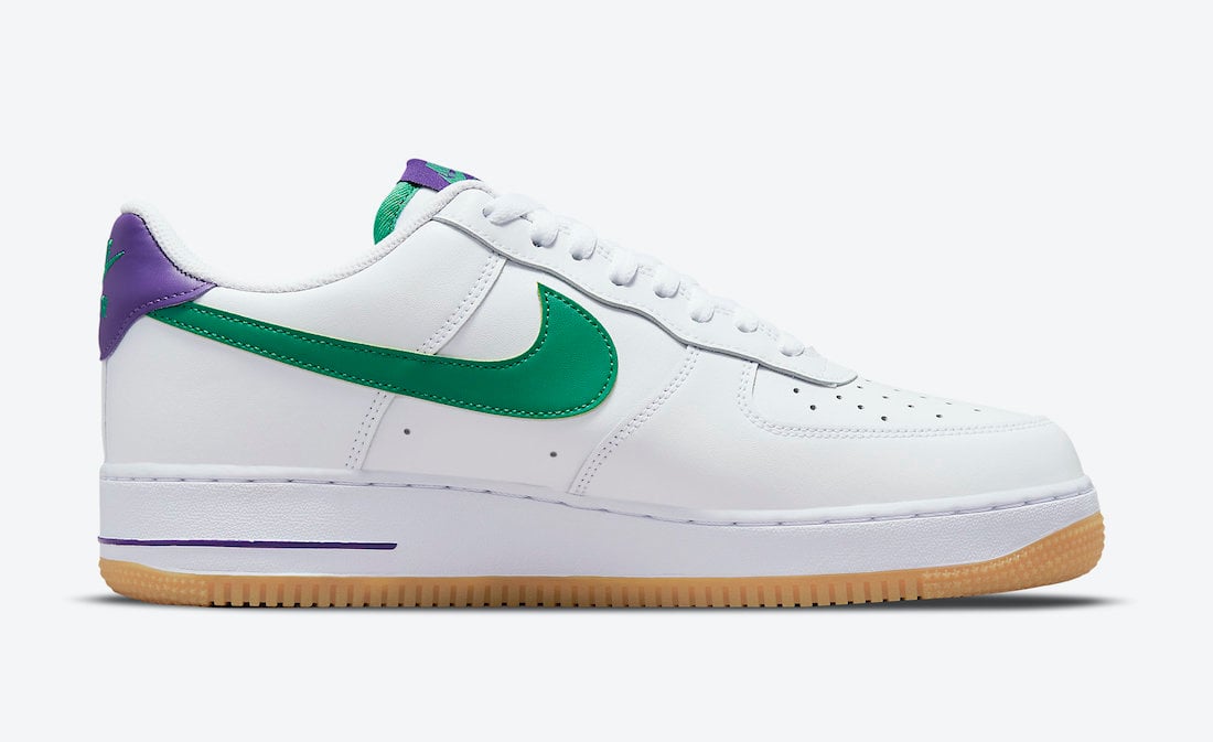 Looking closer, this Nike Air Force 1 Low comes constructed with White leather across the uppers while the same shade hits the tongue, liner, laces, and midsole. Highlighting the pair, we have Green and Purple detailing on the Swoosh, branding, heel, and insoles. Finishing the look is a Gum rubber outsole.