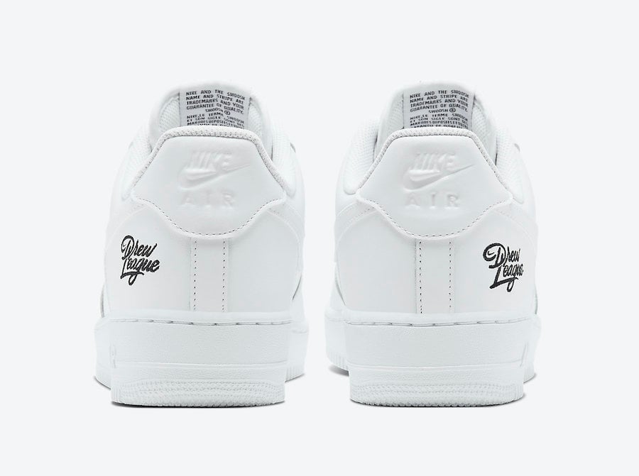 Looking closer this Nike Air Force 1 Low comes highlighted in all White while constructed with leather and then we have perforations on the toe box and panels. The highlight of this pair is Drew League branding embroidered by the heels, tongue label and lands on the insoles while White covers the midsole and rubber outsole.