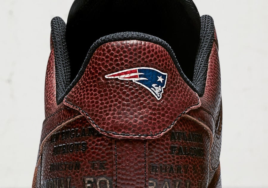 The shoeโs laces are laces from those footballs. The game logo is on the forefoot and the Patriots logo is on the center of the heel, while the game’s details are listed below.