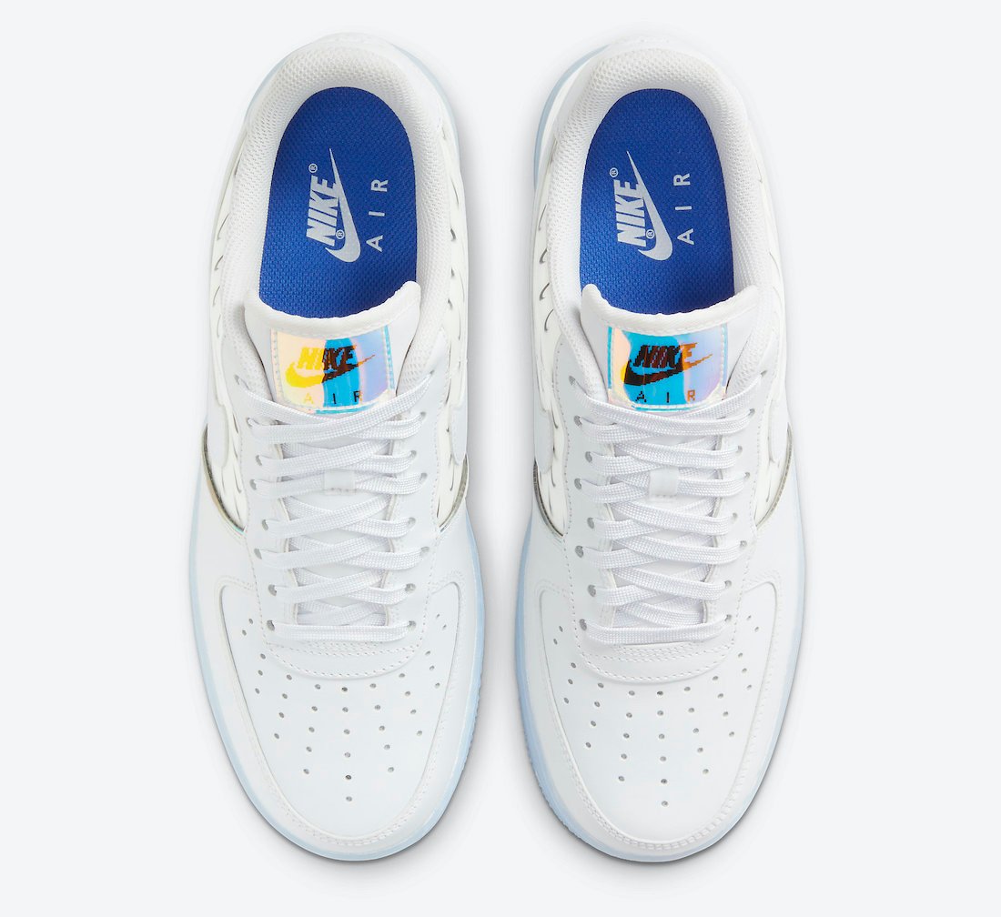 This Nike Air Force 1 comes dressed in a White, Multi-Color, and Racer Blue color combination. First, the pair comes with White on the base along with holographic detailing. We also have stitched overlays and multiple mini Swoosh logos across the panels that expand across the heel. Finally, an icy midsole and matching rubber outsole finish the look.