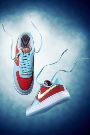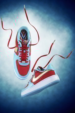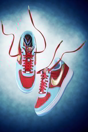 Designed with the dragon boat concept as a primary inspiration, the upper includes red suede with an embossed scale pattern, while the outsole and part of the upper are made of bright blue leather. The overall design echoes that of a dragon boat, evoking a red boat floating on a blue lake, with the golden Swoosh emphasizing the nobility and majesty of the dragon.