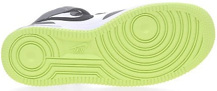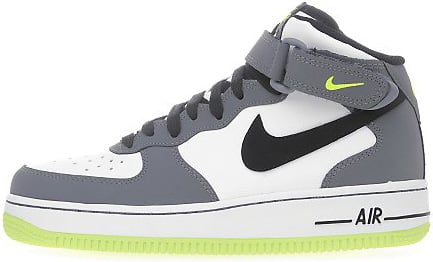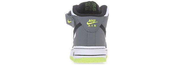 Nike applies a common colorway (close to it) to the Air Force 1 Mid, available for kids. This pair of Nike Air Force 1 Mid‘s feature a White/Black/Volt Lime-Cloud Grey, similar to the Air Max 95. Using nubuck on the panels and leather. Available now at JD Sports for about $65 USD.