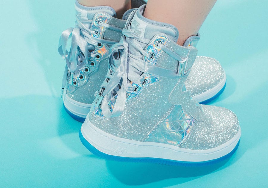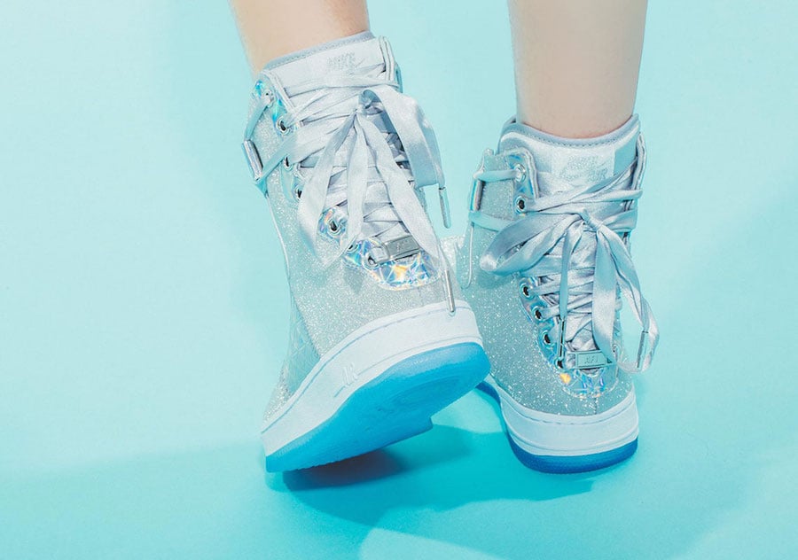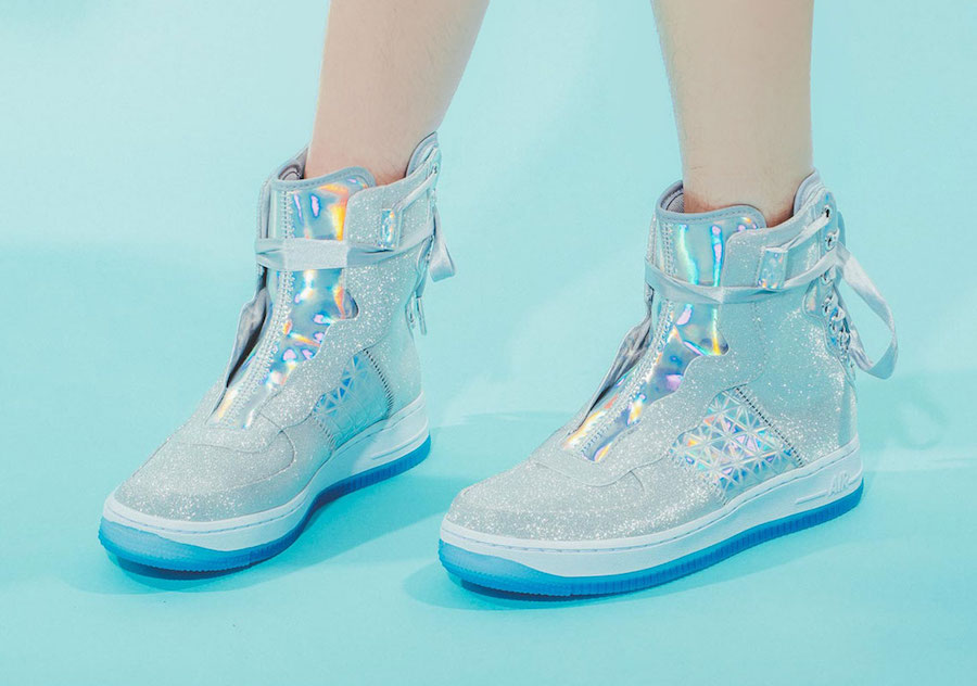 As you can see it features a flashy theme while utilizing a diamond like design across the upper while quilted iridescent is applied to the sides and tongue area. Following is the use of White across the midsole while an icy translucent Blue outsole completes the look.