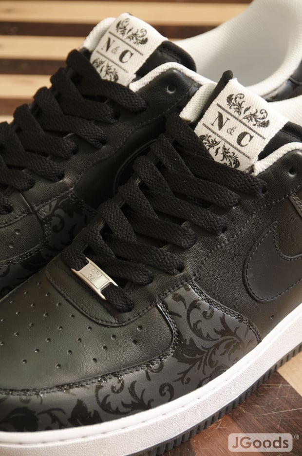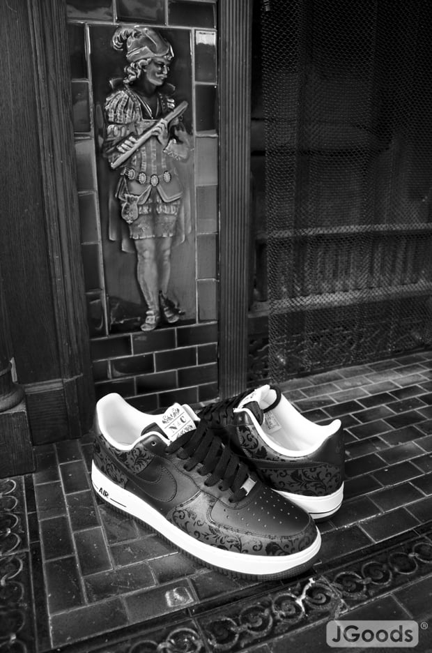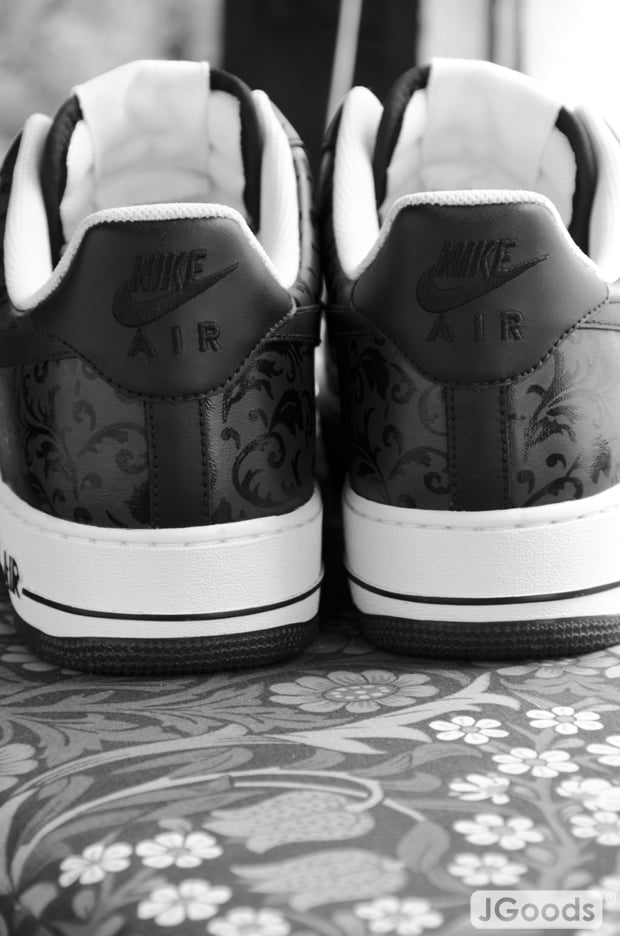 The uppers on this custom AF1 features a matte dark grey toe box and heel with meticulously hand painted black Victorian floral pattern for that old, 1800’s look. The shoe also features a white midsole, sock liner and custom tongue tag. These 1 of 1 gems definitely showcase his level of attention to detail and quality.