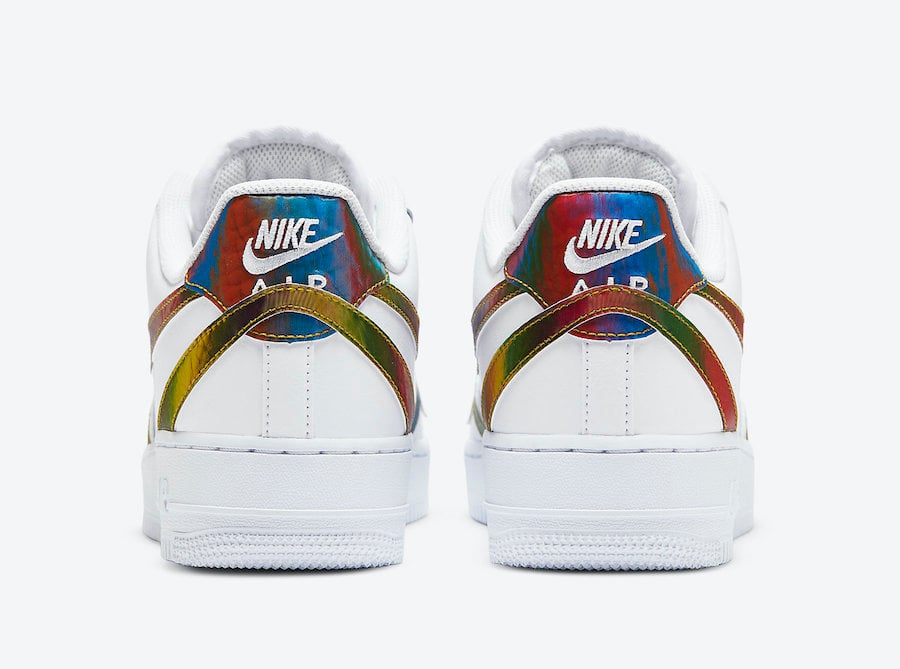This Nike Air Force 1 Low is similar to John Geigerโs โMisplaced Checkโ. Looking closer they feature White leather across the upper while highlighted with multiple misplaced Swoosh logos that have an iridescent finish. More iridescent is seen on the tongue and heel while White lands on the midsole and rubber outsole.