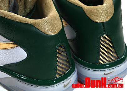 Recently, a pair of Nike Air Force 25 Lows was spotted that was obviously worked on by DJ Clark Kent and made part of the very limited 112 pack. Now, the mid-top Nike Air Force 25 has been worked on with the same color palette used on all of Lebron’s PEs for his high school alma mater of Saint Vincent-Saint Mary. With this pair the visible sole is untouched, while the upper comes in predominantly white with a gold Nike swoosh and green on the heel. To top it all off, these actually come with a pair of green laces. So how does this SVSM colorway match up with the SVSM Nike Zoom LBJ Ambassador II? Let us know and check out more pictures after the jump.