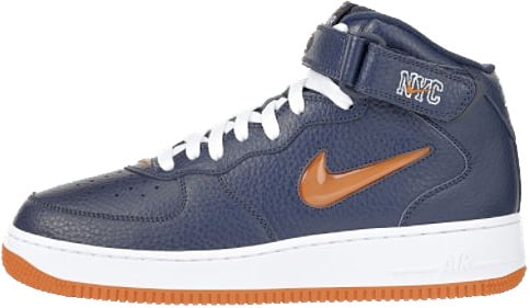 The Nike Air Force 1 (ones) 1997 Mid SC NYC Midnight Navy / Safety Orange – White sports a midnight navy leather upper and white midsole. Safety orange plays its part on the “Jewel Swoosh” which sits on the side of the Nike Air Force 1 (ones) 1997 Mid SC NYC Midnight Navy / Safety Orange – White. Safety orange also brightens up the outsole and strap swoosh. Sitting behind the strap swoosh is “NYC” embroidered, giving the shoe its well deserved individuality.
