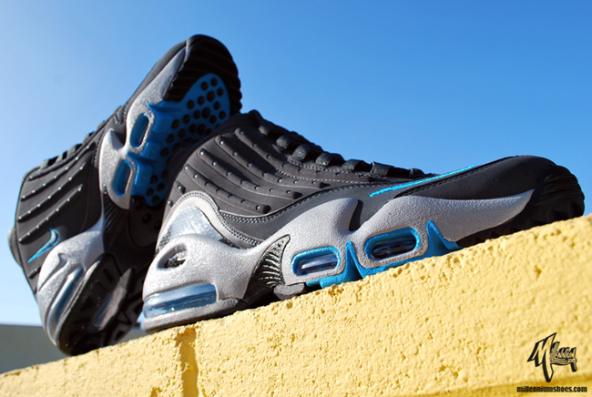 Today, we preview another solid colorway of the Nike Air Griffey Max II (2) in Anthracite/Turquoise. The upper is composed of a micro fiber material in Anthracite, carbon heal counter and the visible air unit. The rest of the shoe is accented with splashes of turquoise for contrast.