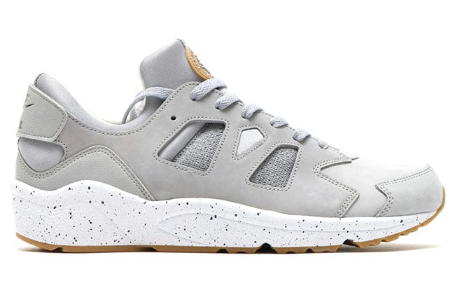 Having a similar look and feel as the Air Huarache, the International edition uses different styling on the overlays, but contains the neoprene bootie. For this pair, they feature a Wolf Grey base with nubuck. Following is gum that lands on the Huarache emblem on the tongue and outsole. The final touch is a White midsole that features a Grey speckled overlay.