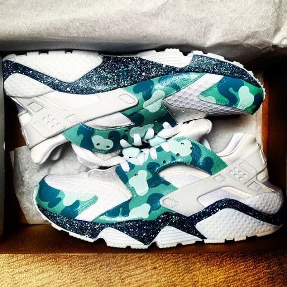 The Nike Air Huarache “Mint Camo” customs by Poco Bentley feature a mint green camouflage print, with hues of blue and white accents incorporated in the pattern. The camouflage pattern attacks the toe caps and midfoot overlays, while the rest of the mesh and leather uppers remain in a crisp white. The midsole gets in on the action as well, arriving in a dark blue, galaxy-like design. Speckles of mint green, blue and white shower the dark blue base on the midsoles, which is layered by the rigid outsole of the Air Huarache.