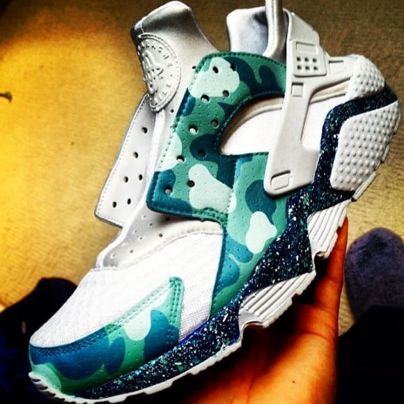 There’s no way someone walking past in these kicks is going to go unnoticed. The design is crazy, but in a good way! The unifying tones used in the camouflage pattern and speckled midsole are aesthetically pleasing, to say the least. The shoes even complete with mint green lace accessories! Check out more angles of the Nike Air Huarache “Mint Camo” customs down below, and go ahead and get in touch with Poco Bentley if you’re interested in a pair of these kicks!