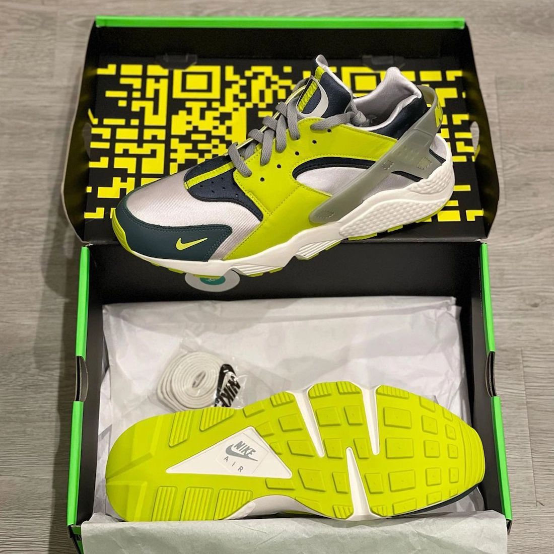 This Nike Air Huarache features a Vast Grey, Bright Cactus, and Sail color combination. Constructed with the usual neoprene and leather. Next, the โOโ logos appear on the tongues and a mini Swoosh on the forefoot. Each pair is individually numbered on the inside of the tongue and comes with special packaging.