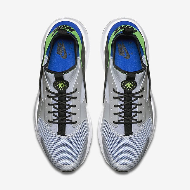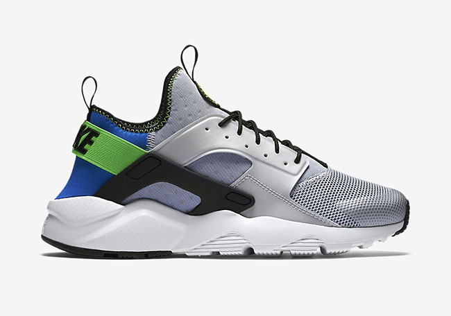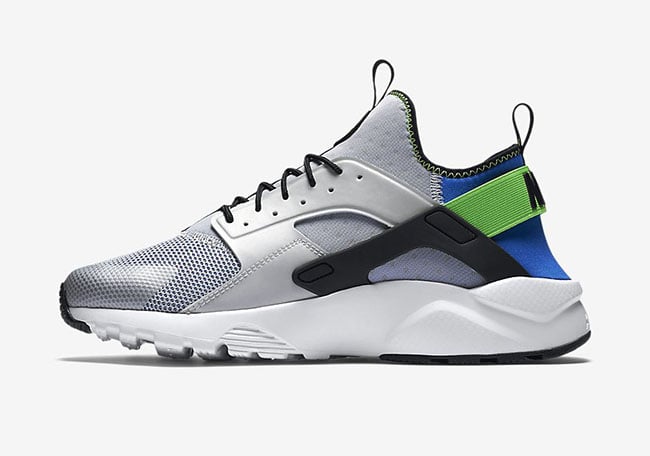 Featuring Royal Blue, Black, Scream Green, Pure Platinum and White throughout. Up first is pure platinum that runs through the base. Following are scream green and royal blue accents around the heel and Huarache logo. Other details include black hits along with a white midsole.