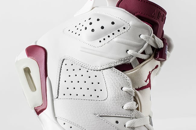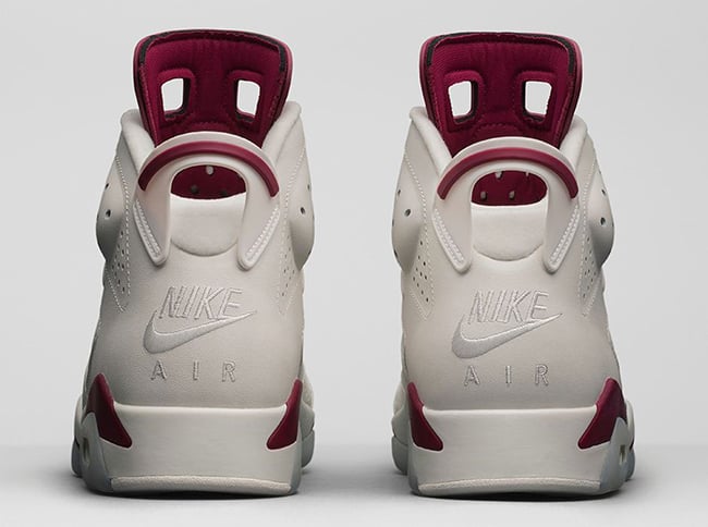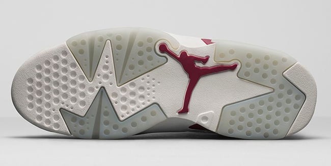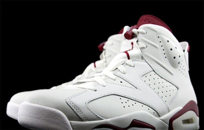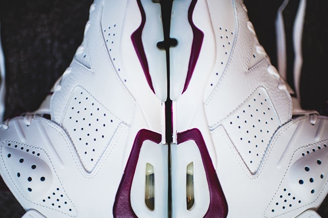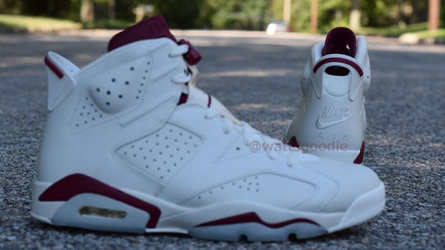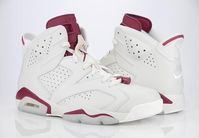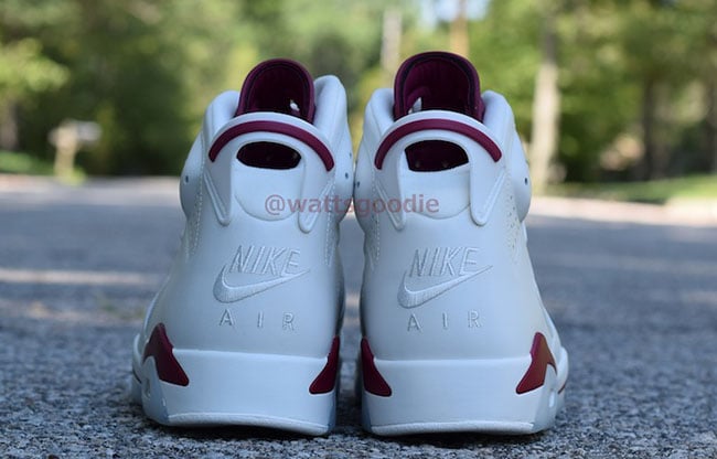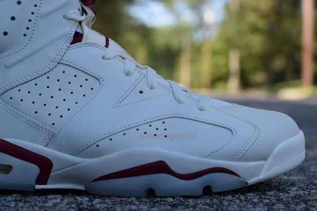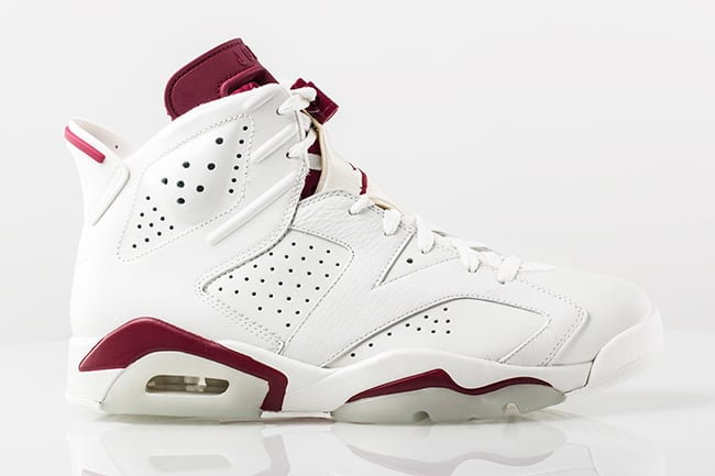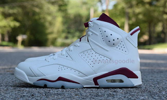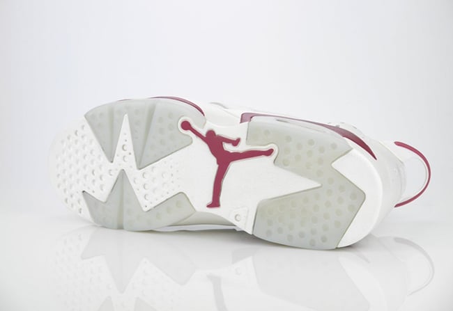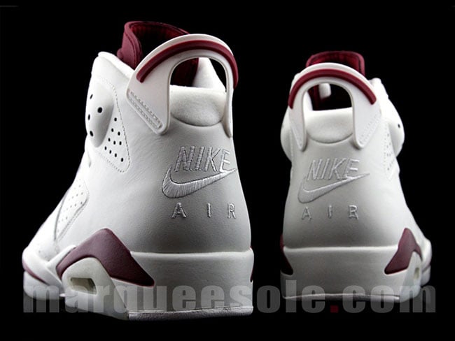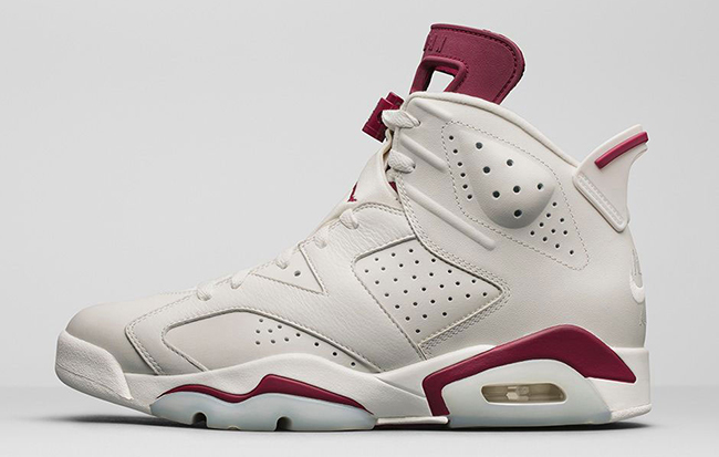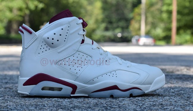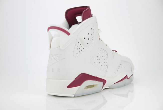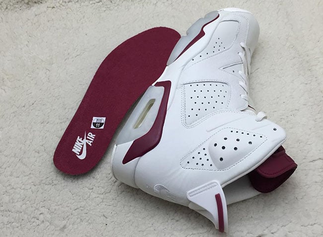 The Maroon Jordan 6 will feature a white upper with hits of perforation on the paneling. Maroon accents line up on the midsole, tongue and heel tab and Jumpman logo feature on the tongue, sole and insole. Other details include a translucent outsole while the biggest news here is Nike Air branding will return on the heel and insole.