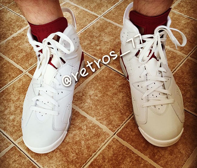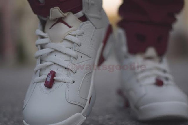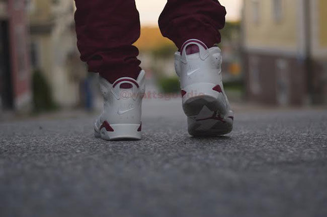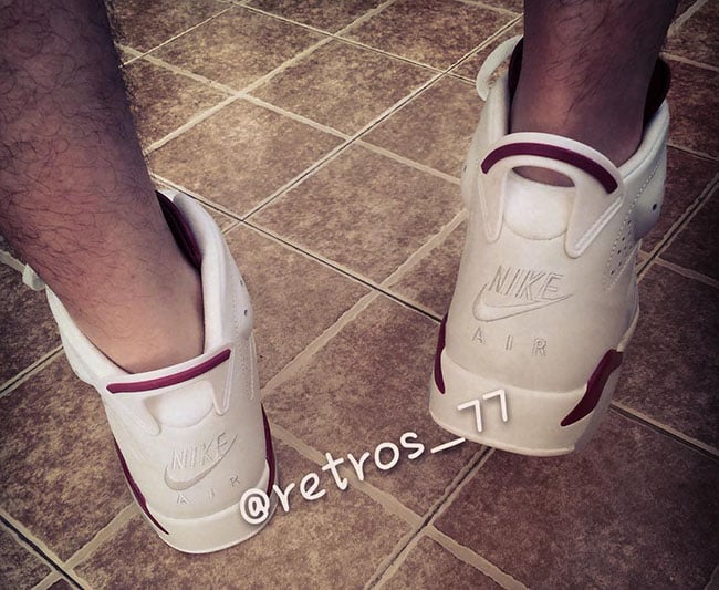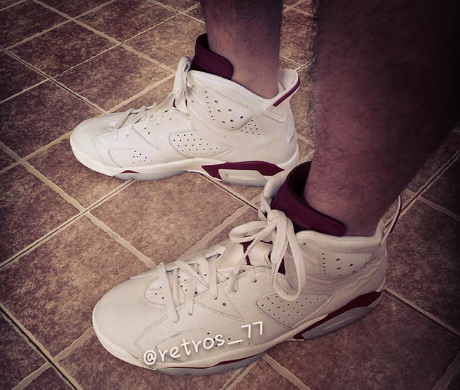 We now have on foot images of the Jordan 6 ‘Maroon’. See below to get your detailed look.