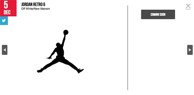 Update: One of a few highlight anticipated releases during December, the Nike Air Jordan 6 ‘Maroon’ is available early on eBay. You will have to pay a little over retail for this pair, but at least you don’t have to wait in lines.