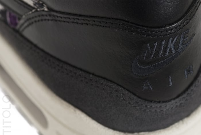 The Air Max 1 “Aztec” features a black leather and anthracite suede upper with the standard AM1 white midsole and a black waffle outsole. ย Like the others in the pack, the AM1 sports the tribal Aztec print, this time done in black, anthracite, and purple.