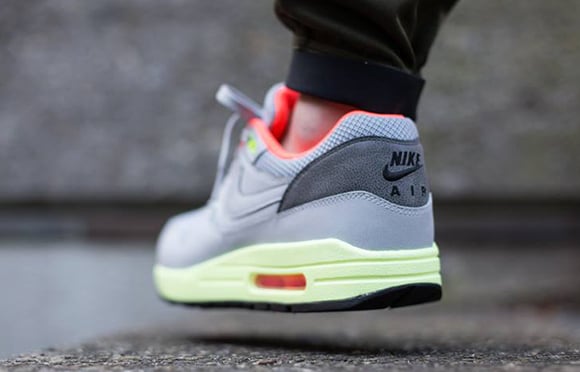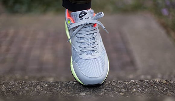 This Nike Air Max 1 FB features wolf grey on the uppers that are joined with mesh and suede. Accenting the shoes is the use of liquid lime which is seen on the midsole and eyelets. Not listed on the color description is pink, which hits the air unit along with the liner.