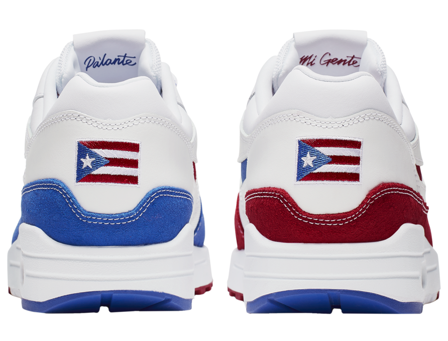 This Air Max 1 comes in a mismatch theme, something we are seeing more of as of late. Dressed in the Puerto Rican flag colors, the left shoe features Blue on the mudguard while the right shoe uses Red. In addition the color blocking throughout is also flipped. Other details includes the Puerto Rican flag embroidered on the heel along with โPaโlanteโ and โMi Genteโ placed on the inside of the tongues.