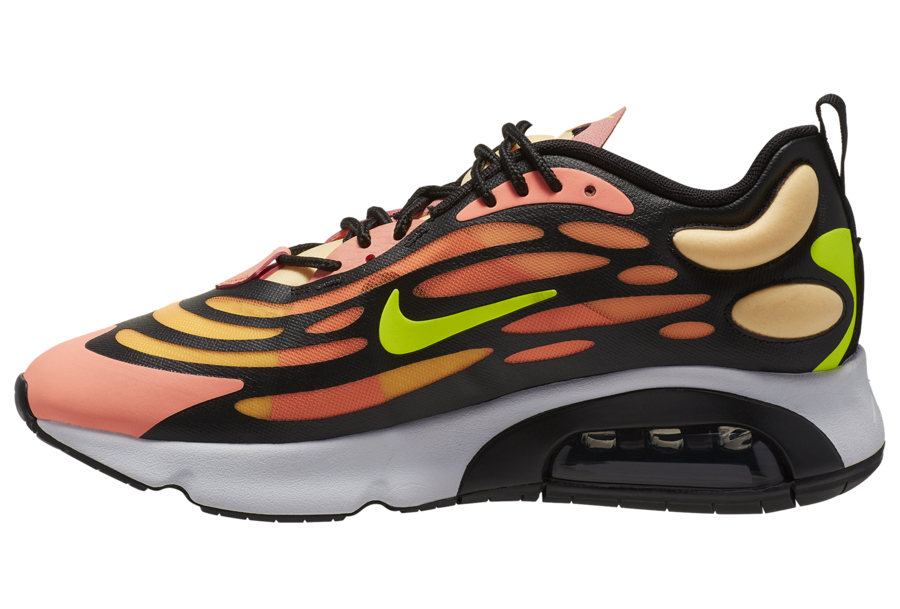 This Nike Air Max 200 features various shades of Orange throughout while Black is placed on the overlays. In addition we have Volt which lands on the Swoosh logos and heel which brings some extra pop. Completing the look is a White midsole and Black rubber outsole.