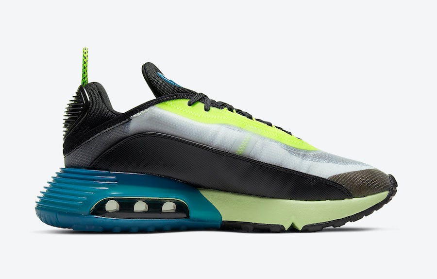 Coming dressed in a White, Black, Volt and Blue Force color combination. This Nike Air Max 2090 uses Black textile leather on the mudguard while transparent mesh is seen on the base. More Black is seen on the mesh tongue and on the heel. Both Volt and Blue accents are placed throughout which gives this pair some pop. Other details includes a Green midsole and Black rubber outsole.