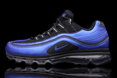Last time we showed you a Nike Air Max 24-7 it was covered in metallic gold and black. This time around, it seems as though the Nike design team is trying to feed off the retro release energy that the upcoming Nike Air Foamposite One “Penny” is giving off. Pictured here is a black/blue spark colorway of the Nike Air Max 24-7, whose upper looks to boast a royal blue foamposite touch. Perhaps this can be a consolation prize or complementary foamposite purchase. Either way, you can purchase this Nike running shoe from select Nike carriers now.