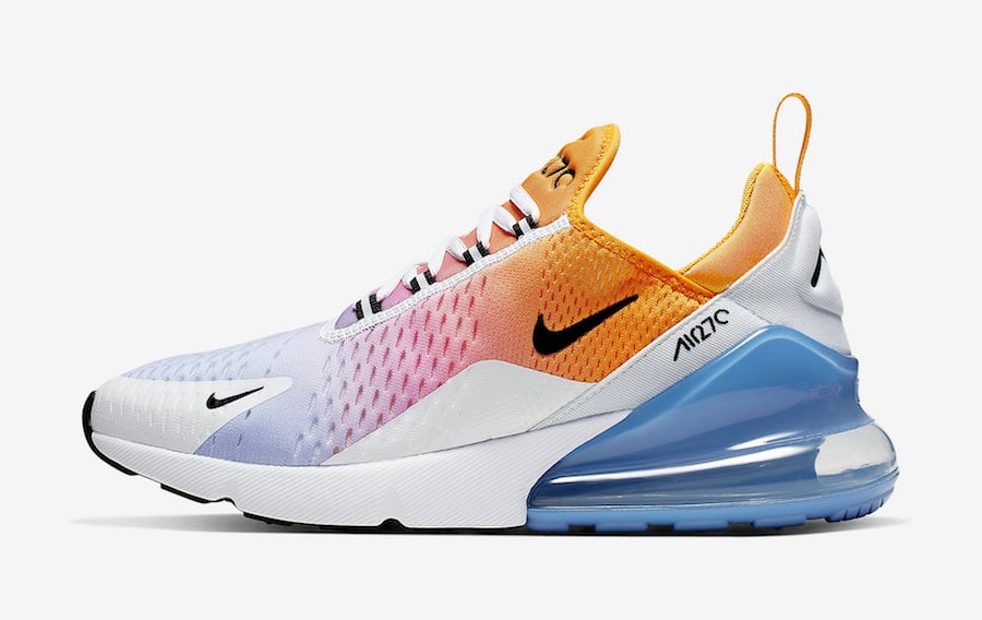 A few of the main colors used is University Gold, Black and University Blue. Looking closer this Nike Air Max 270 comes highlighted with a gradient upper which displays shades of Blue, Orange and Pink. Following we have Black on the branding while White lands on the overlays, midsole and laces. Other details includes Blue within the Air Max unit while Black covers most of the rubber midsole.