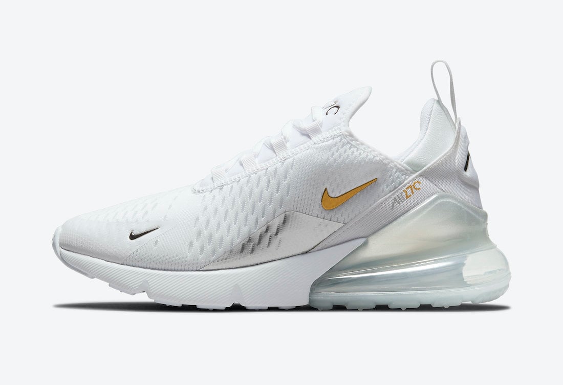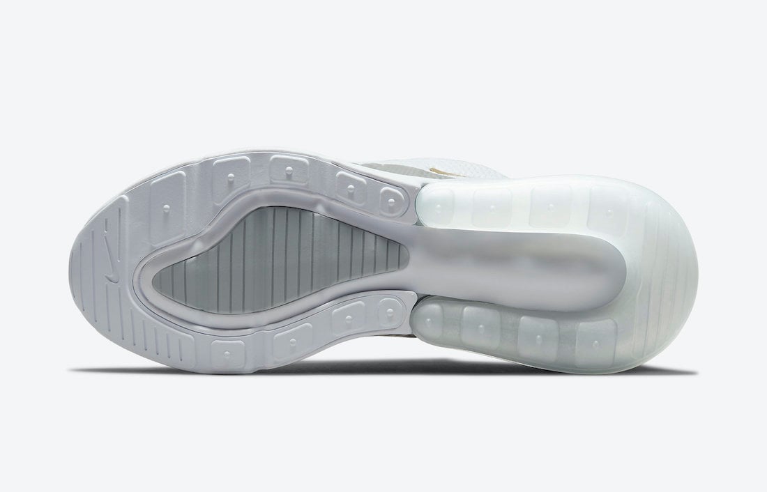 This Nike Air Max 270 comes dressed in a White, Metallic Silver, and Metallic Gold color combination. Utilizing White breathable mesh across the upper along with Silver and Gold accents throughout. Next, White appears on the midsole and outsole while a translucent overlay wraps the heel to finish the look.
