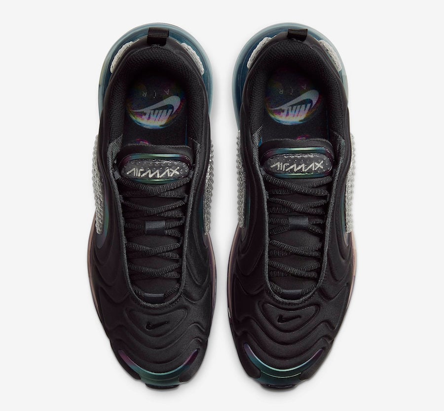 Nicknamed Bubble Pack for its inspiration from bubble wrap, a play on Nike Air and uses a layered air bubble for an iridescent look. This Nike Air Max 720 comes with Black across the base along with iridescent on the plastic overlays. Following we have bubbles on the panels, heel and tongue. Completing the look is a gradient Air Max 720 unit.