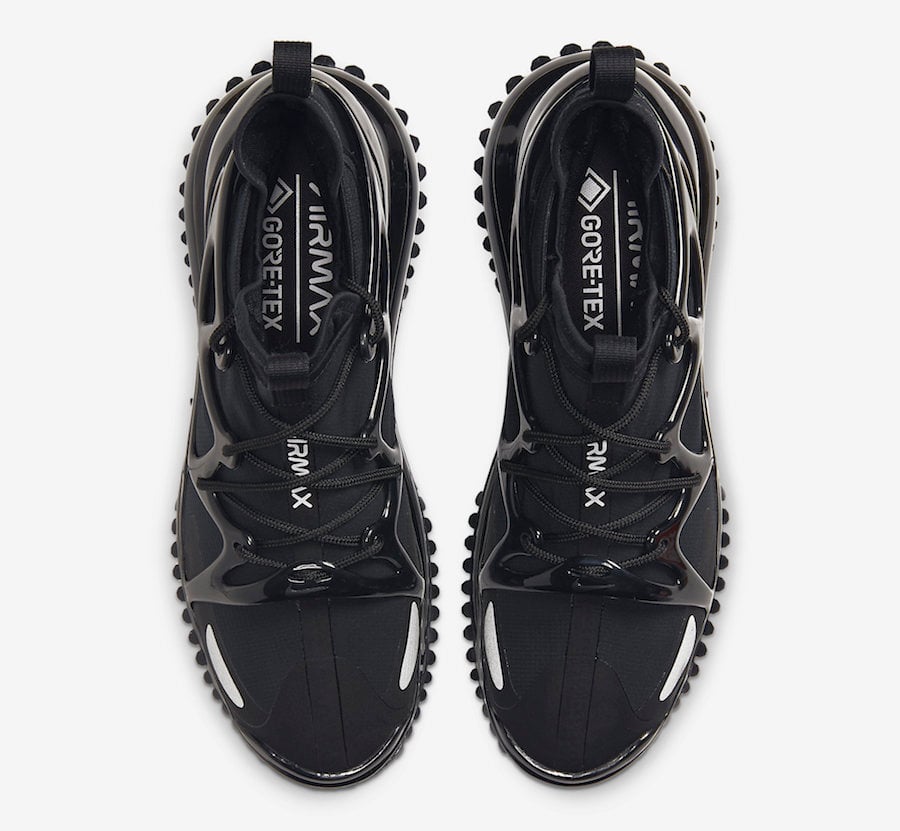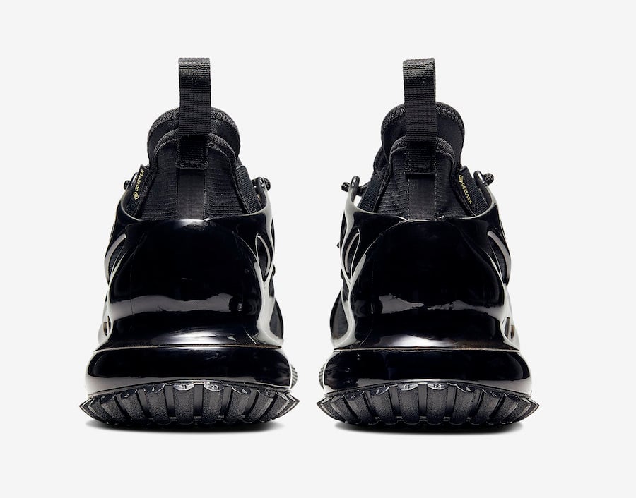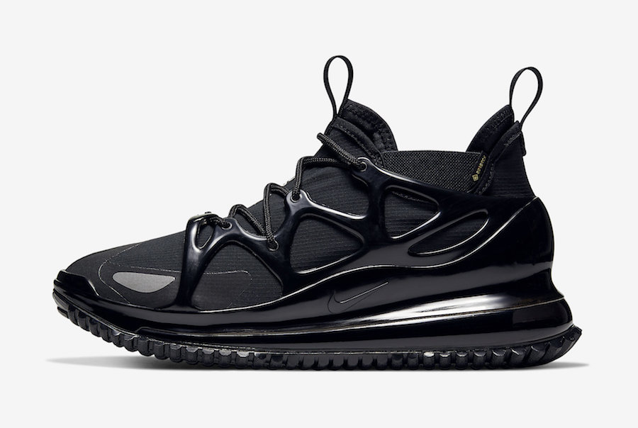 This Nike Air Max 720 Horizon comes dressed in a Black and Vast Grey color combination. Constructed with a water resistant upper along with Gore-Tex. Following we have a plastic overlay, Gore-Tex label on the elastic ankle and Black on the Air Max 720 unit. Finishing the look we have branding on the tongue and insole along with a new outsole built for the harsher weather.