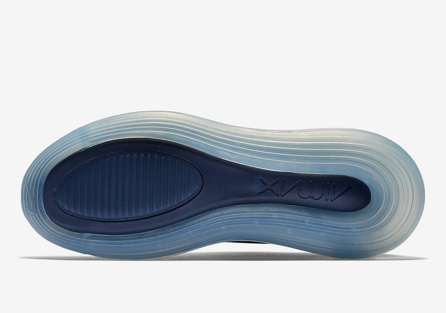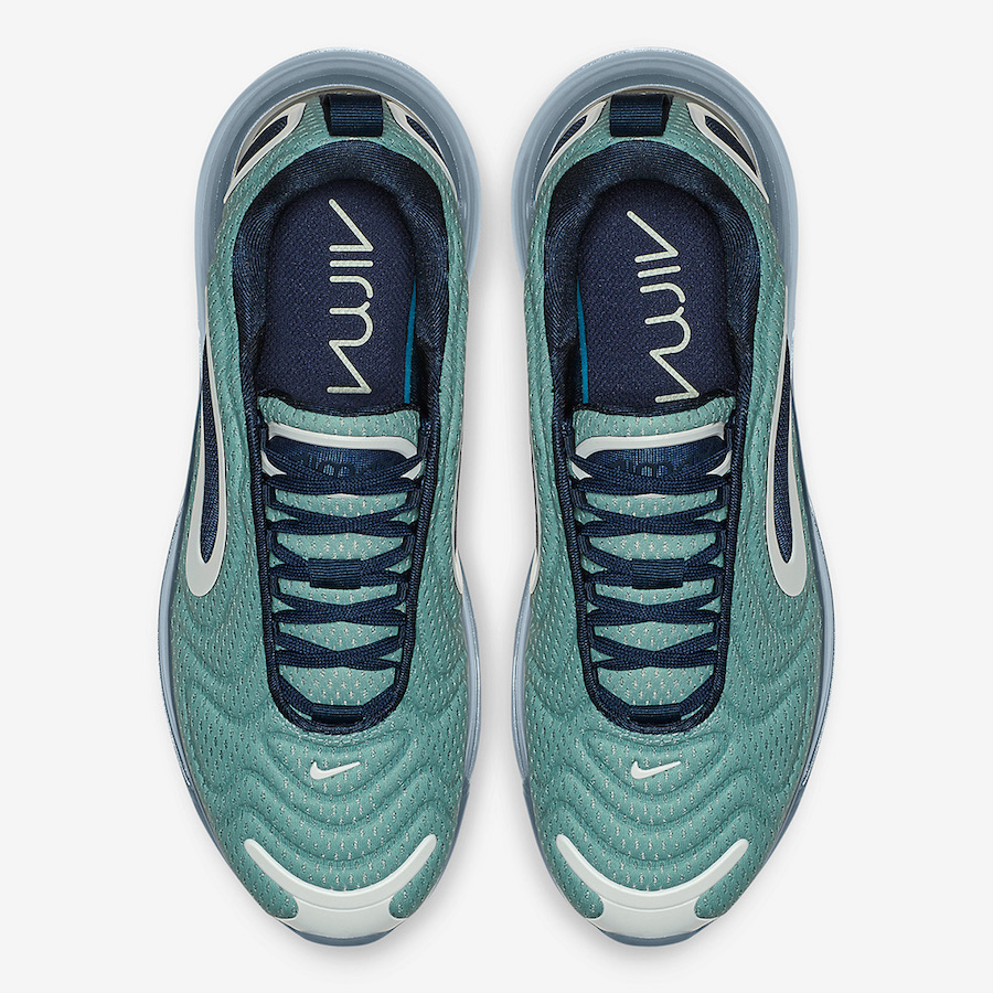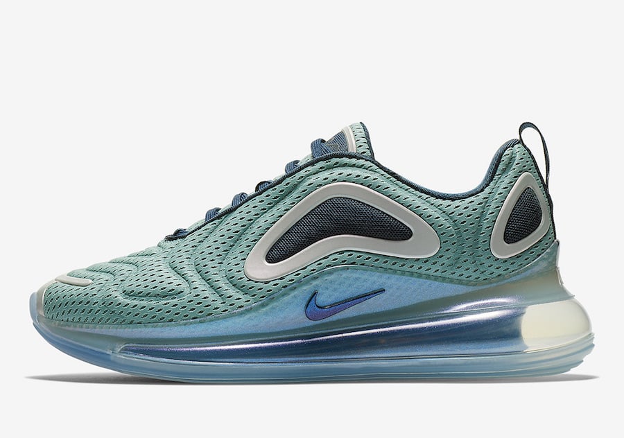 Looking closer this Nike Air Max 720 comes dressed in a Metallic Silver and Midnight Navy color combination. Across the upper is a Green shade of mesh while Grey lands on the plastic overlays. Navy is used on the liner, laces and heel while a transparent Air Max unit and translucent outsole completes the look.
