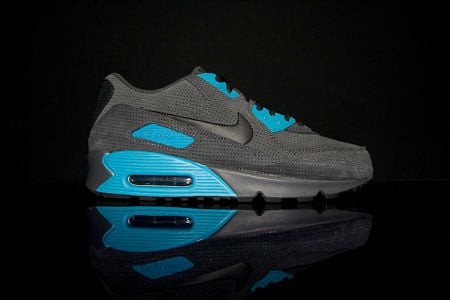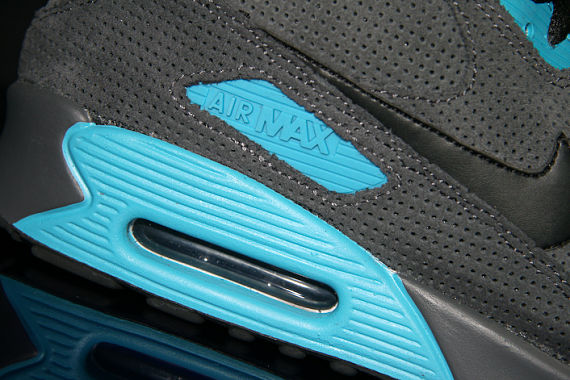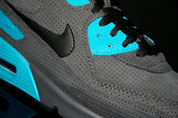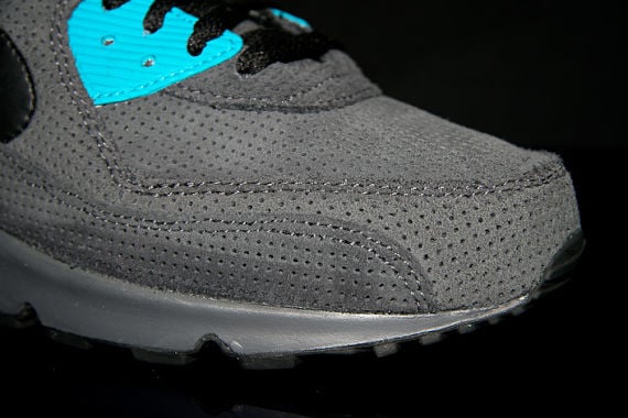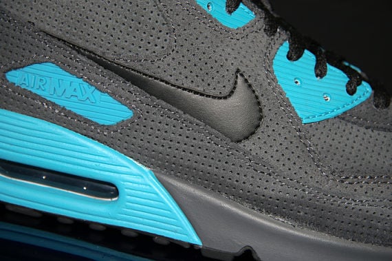 Here are the Nike Air Max ’90 – Anthracite / Black – Neo Turq. This sneaker is a welcomed addition to the other Air Max ’90s that have been released and the ones that will be releasing during the up-coming year. The sneaker is made up of beautiful perforated anthracite / black leather and has accents of neo turq that really pop against their black backdrop. Currently available at Grip. More pics after the jump.