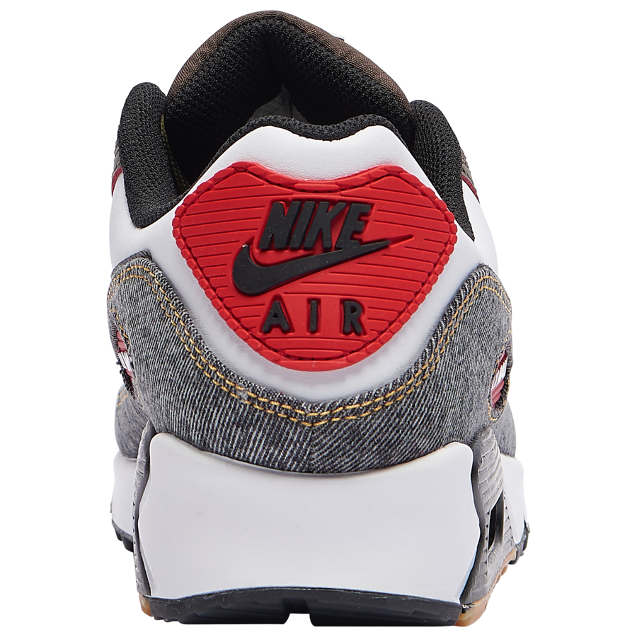 Looking closer this Nike Air Max 90 comes with White leather across the base while Grey leather lands on the overlays. Following we have Red camouflage with hints of White, Red and Black on the overlay and just below it on the mudguard is denim. Following we have Olive on the laces, Red on the heel while Black and Gum covers the outsole to finish the look.