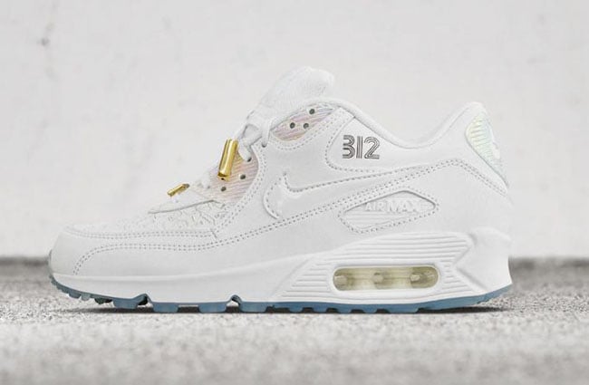 This Nike Air Max 90 dubbed โChicagoโ features a clean pallet while featuring predominate White throughout. Adding some details, the brand has laser engraved various icons that connect to the city that is seen on the toe box and around the collar. Following is the use of iridescent which hits the eyestays while large Gold lace tips and Chicago lace jewel are added. Finishing the look is a White midsole, 312 by the collar and translucent outsole.