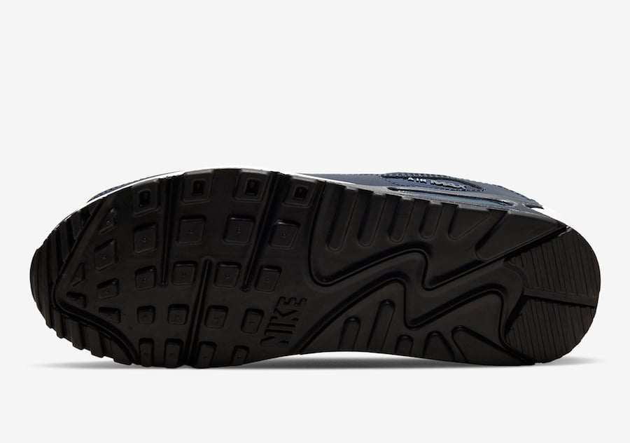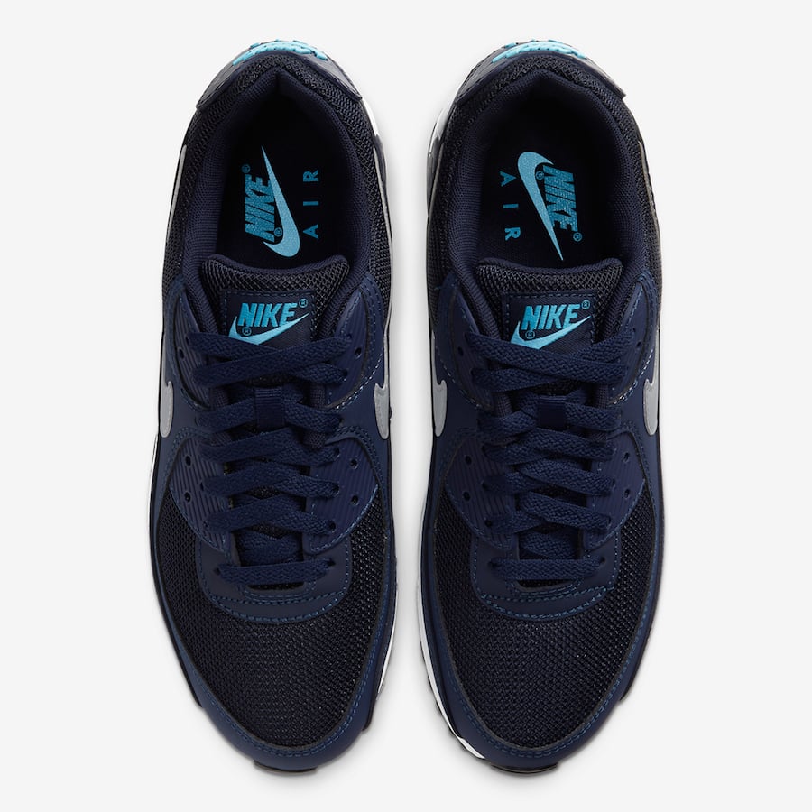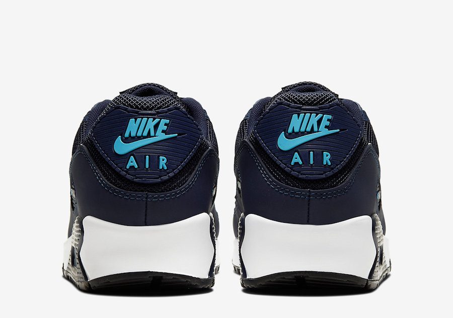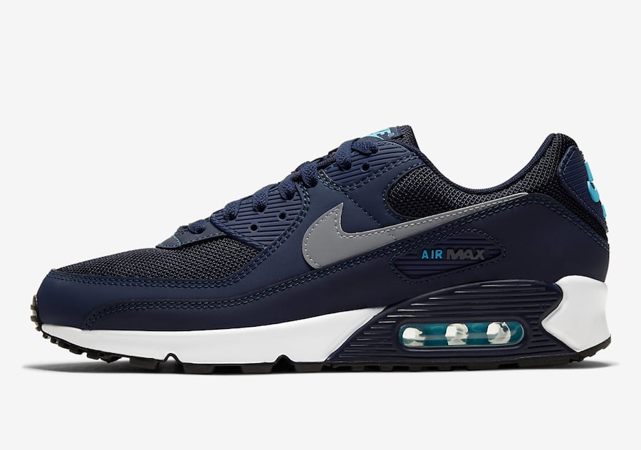 Looking closer this Nike Air Max 90 features Obsidian mesh across the upper while Blue nubuck covers the overlays. Adding some pop is the use of Light Blue on the Air Max branding, tongue, heel, insole and within the Air Max unit. Grey lands on the Swoosh logo while White lands on the midsole and Black on the rubber outsole.