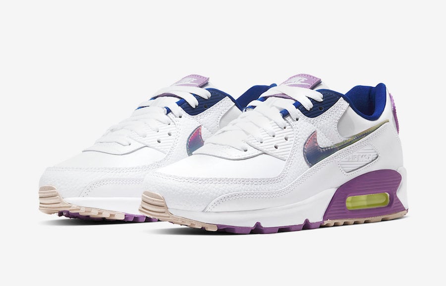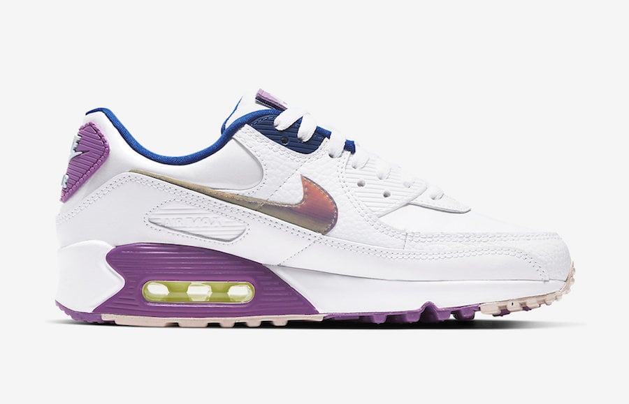 Featuring a White, Multi-Color and Purple Nebula color combination. This Nike Air Max 90 comes with White smooth and tumbled leather across the upper while both Blue and Purple accents are spread throughout. We also have iridescent used on the Swoosh logo along with a velcro tongue patch that, when removed, showcases an egg logo. Finishing the look is another cracked egg on the insoles.