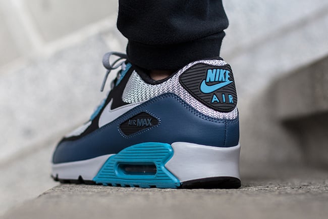 Constructed with leather, suede and leather, the Air Max 90 also comes with various shades of blue seen through the uppers, heel and branding. Following are hints of silver, black and silver.